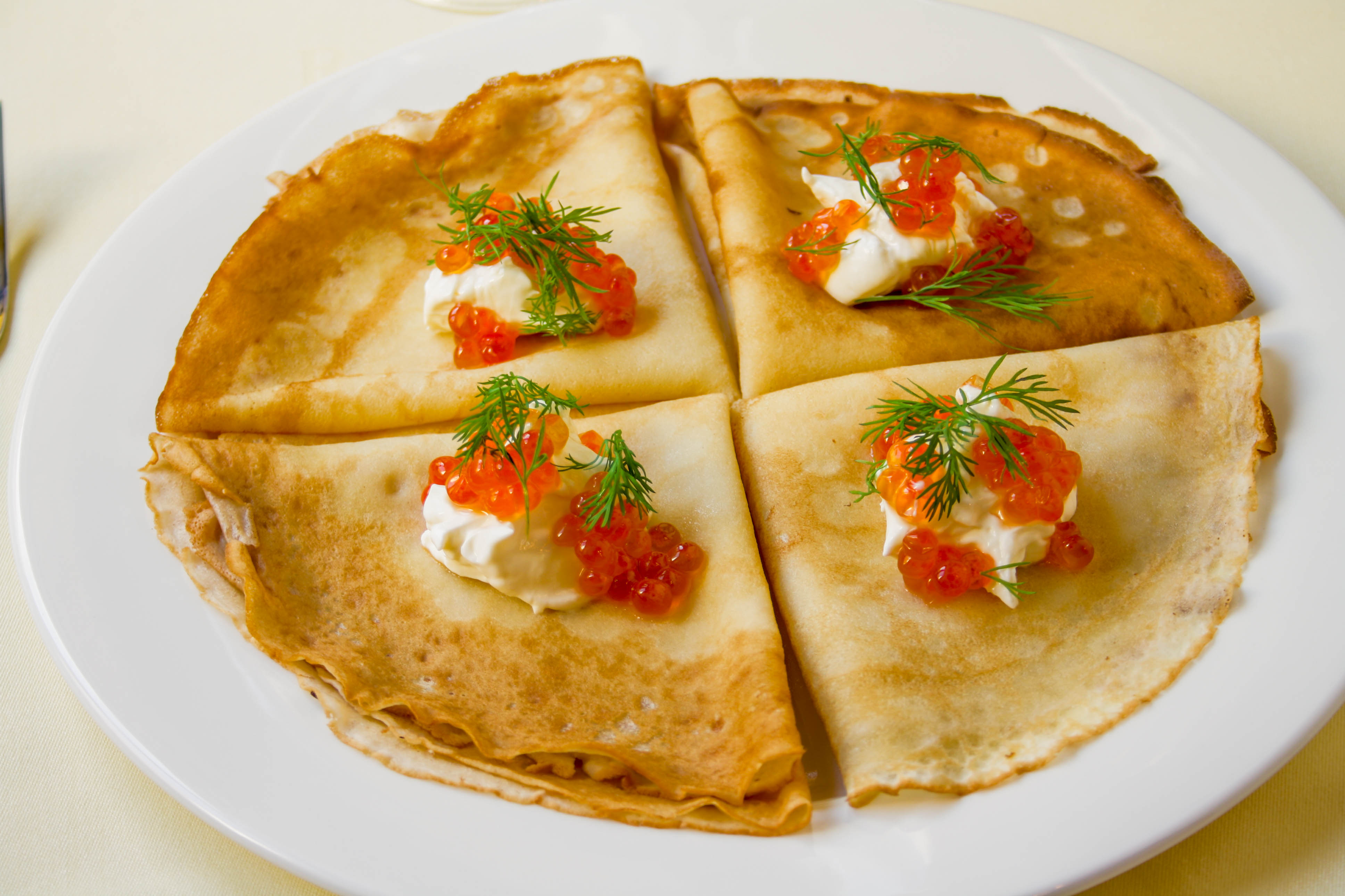 Blinis tradicionales con caviar rojo keta y smetana.