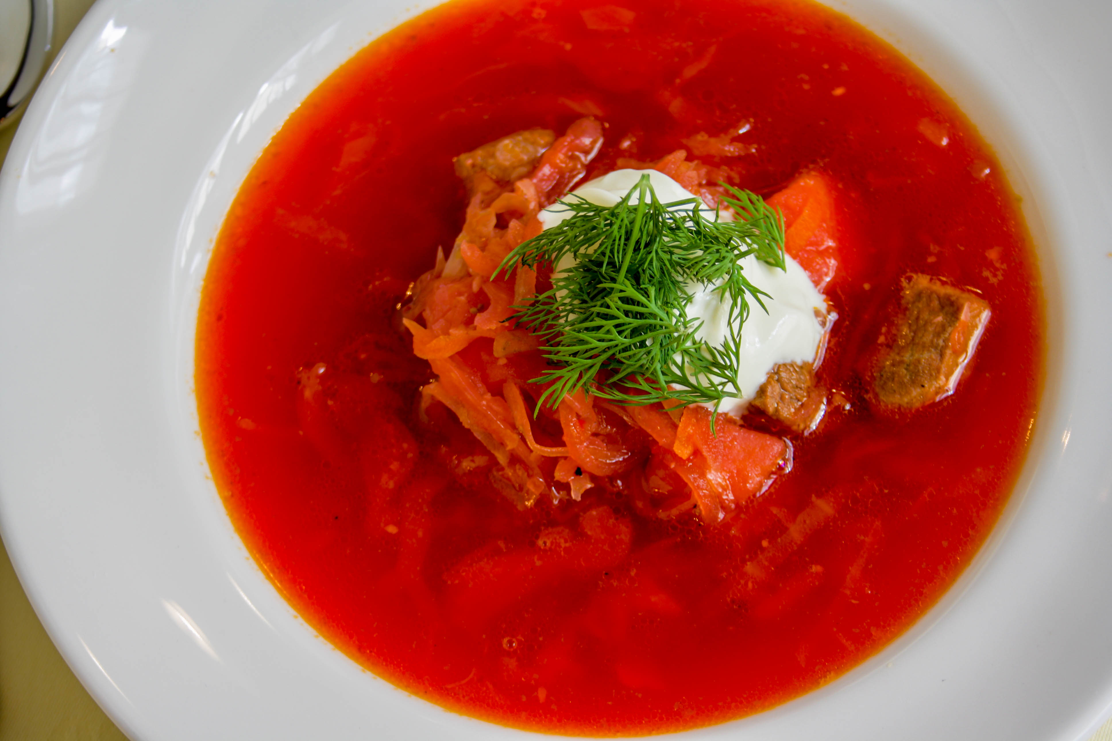 Sopa tradicional de Ucrania, elaborada con remolacha, verduras, ternera y smetana.