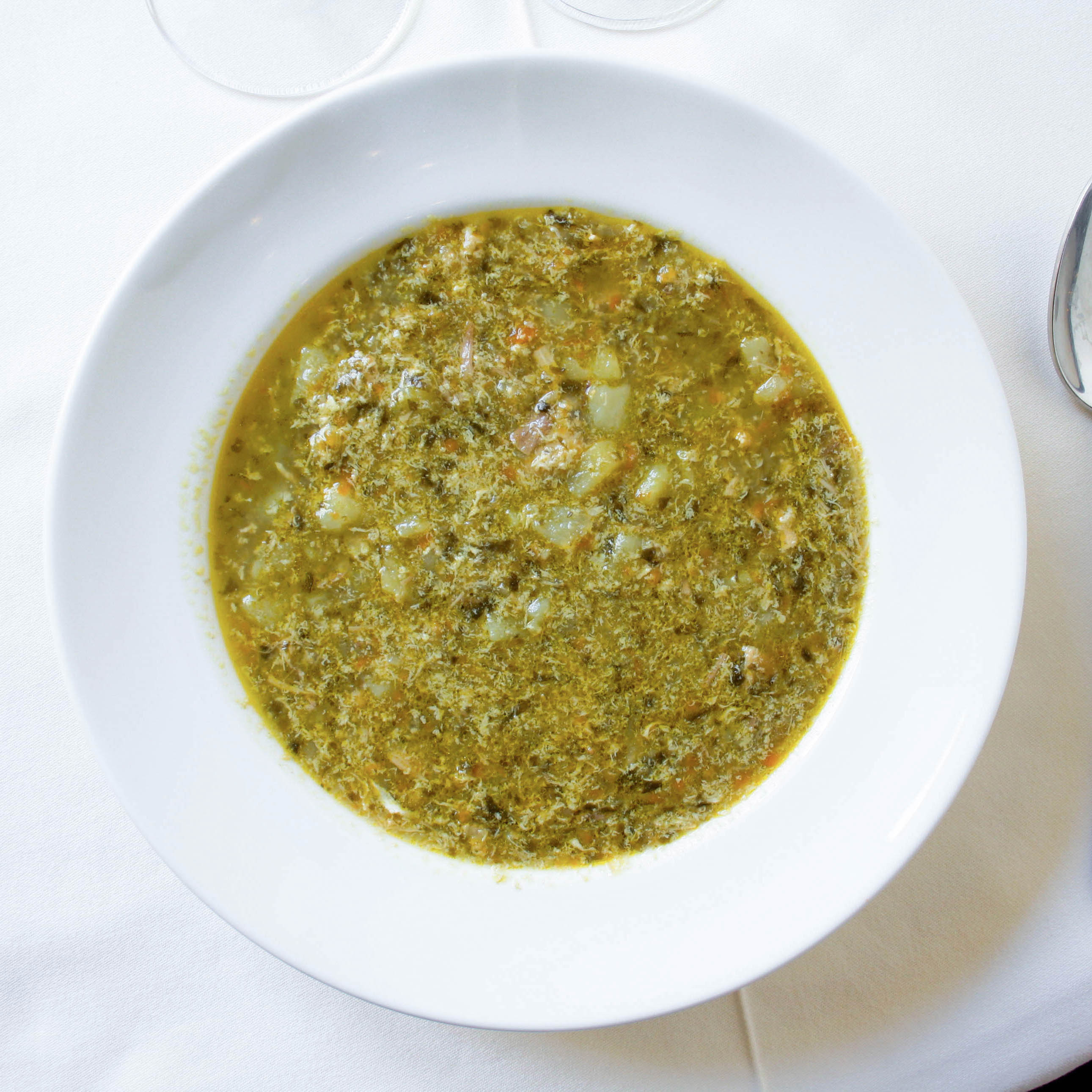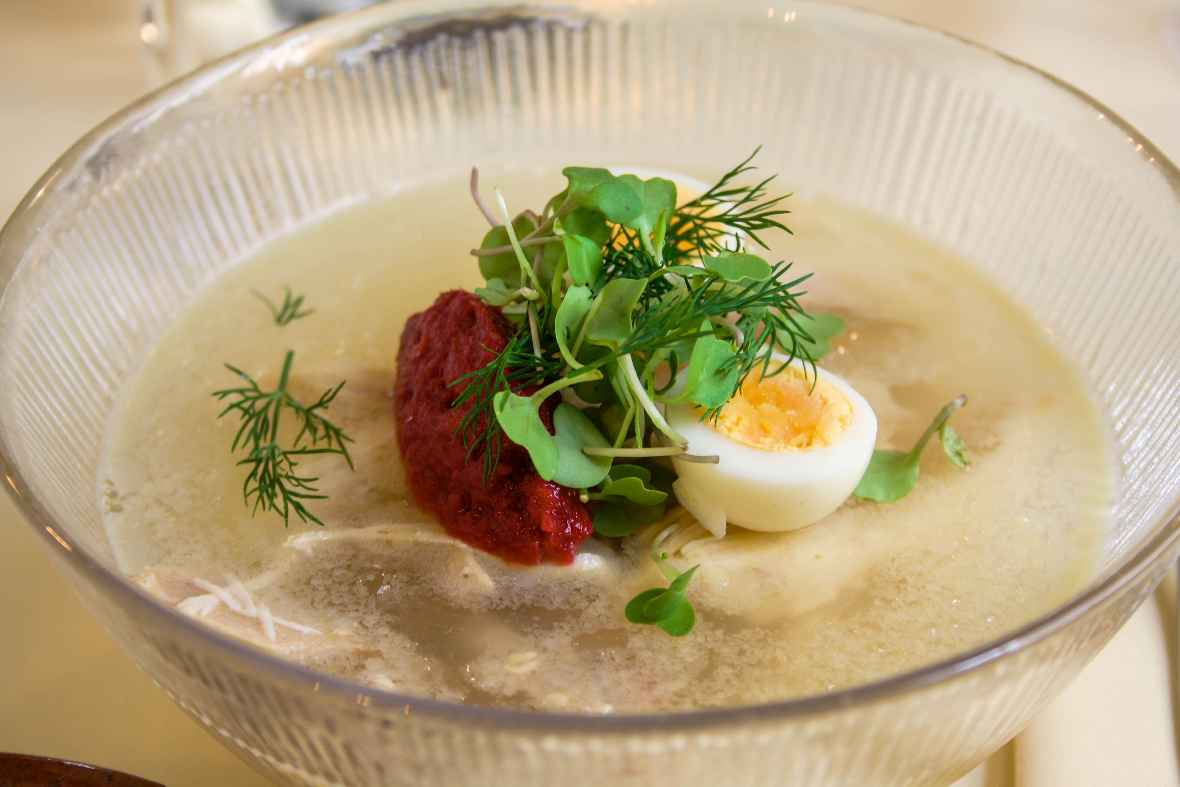 Rico caldo de gallo con pollo, acedera y huevo.