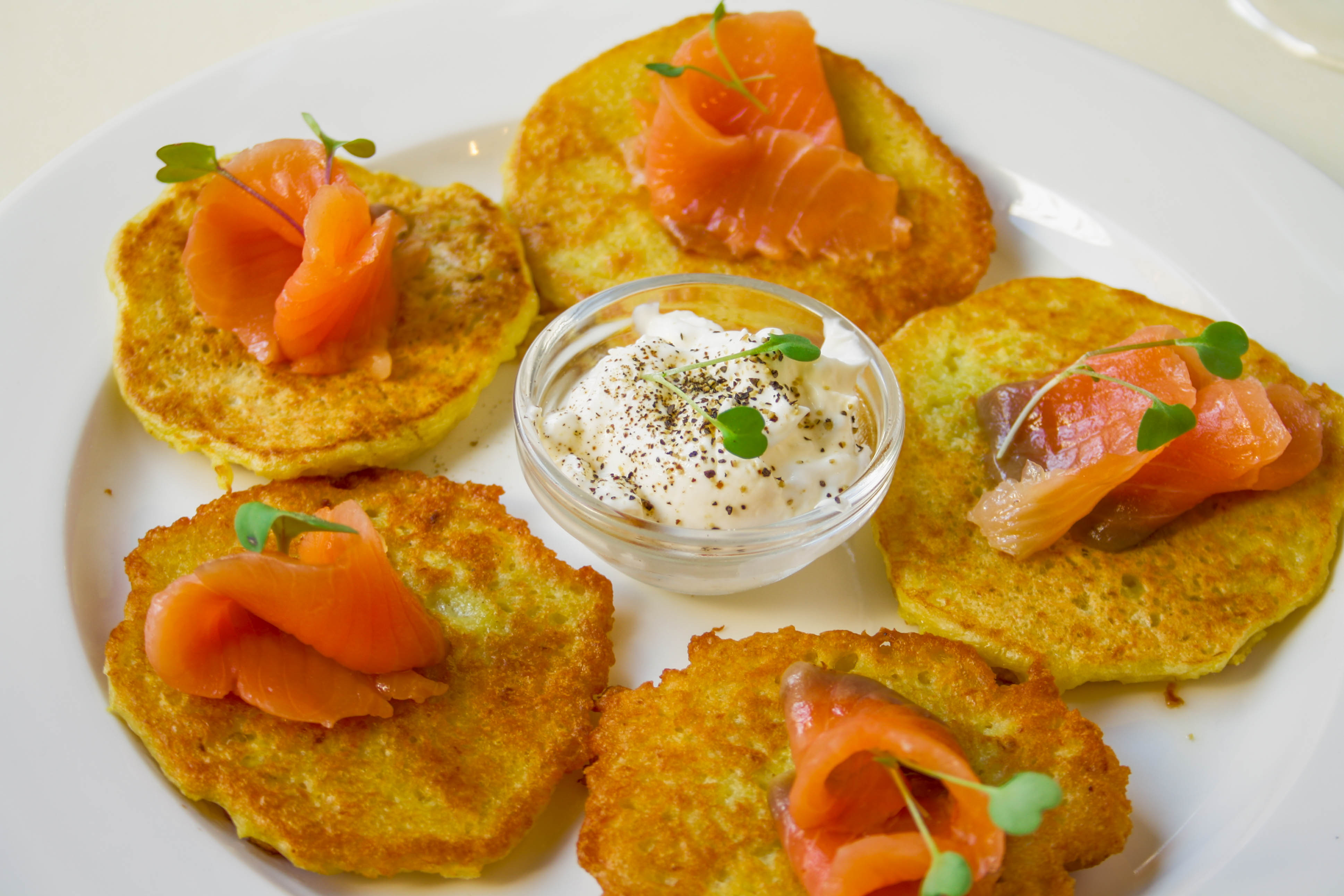 Panqueques de patatas ralladas con salmón marinado.