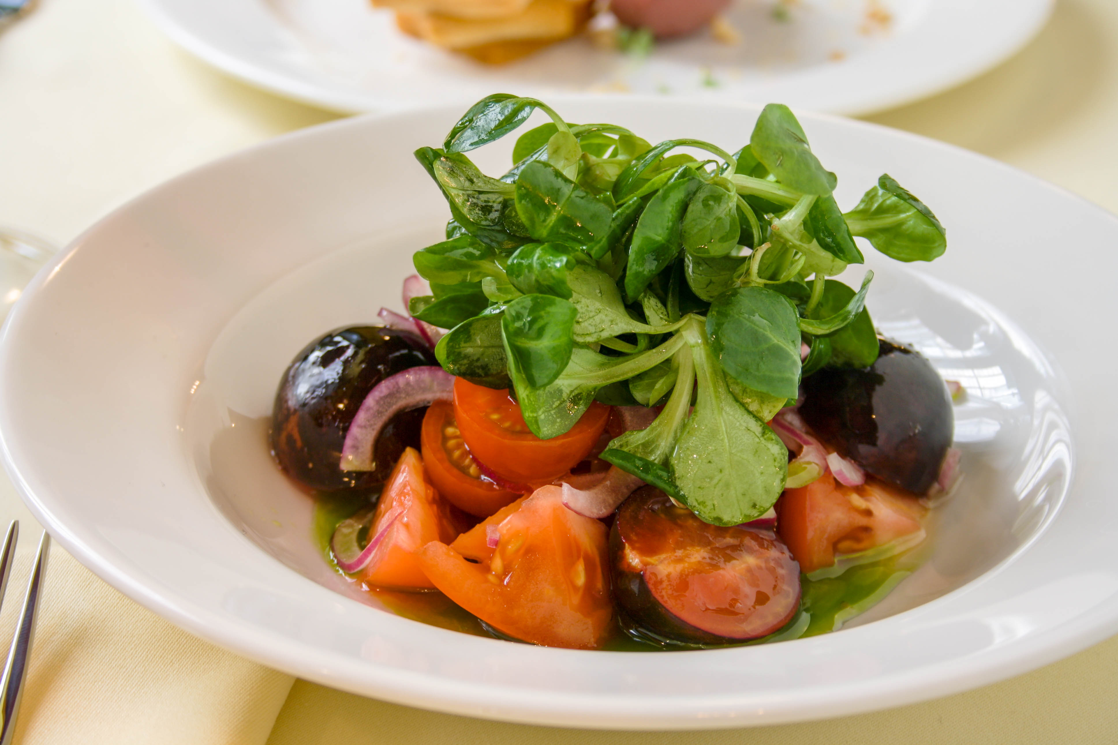 Ensalada de tres tipos de tomate con cebolla morada, aceite rústico y pipas de calabaza.
