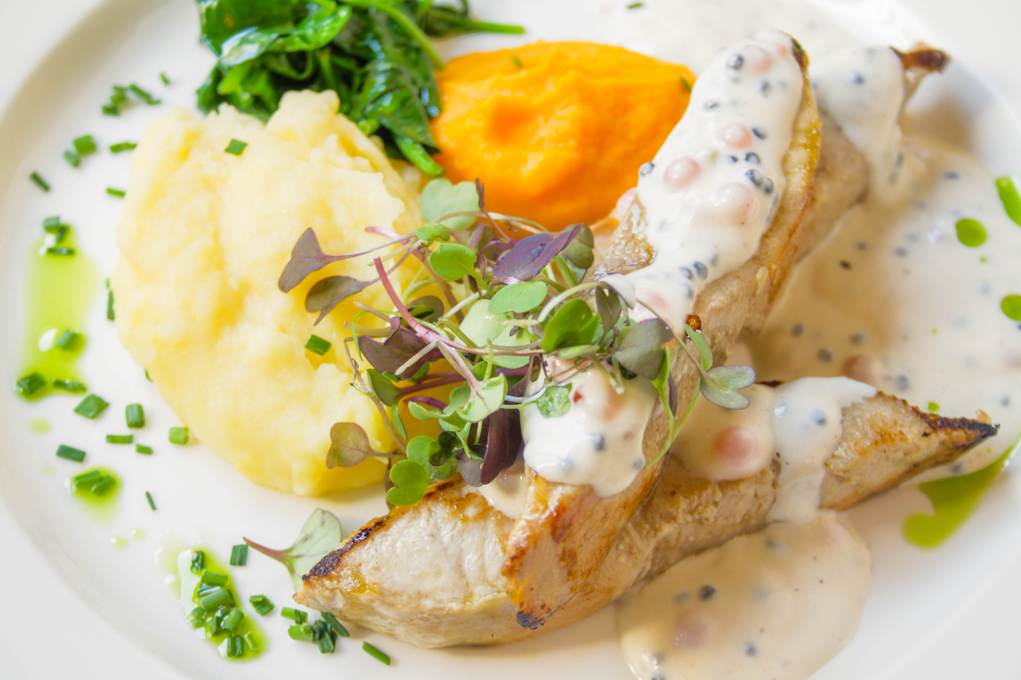 Filete de esturión en salsa cremosa de caviar rojo y negro.