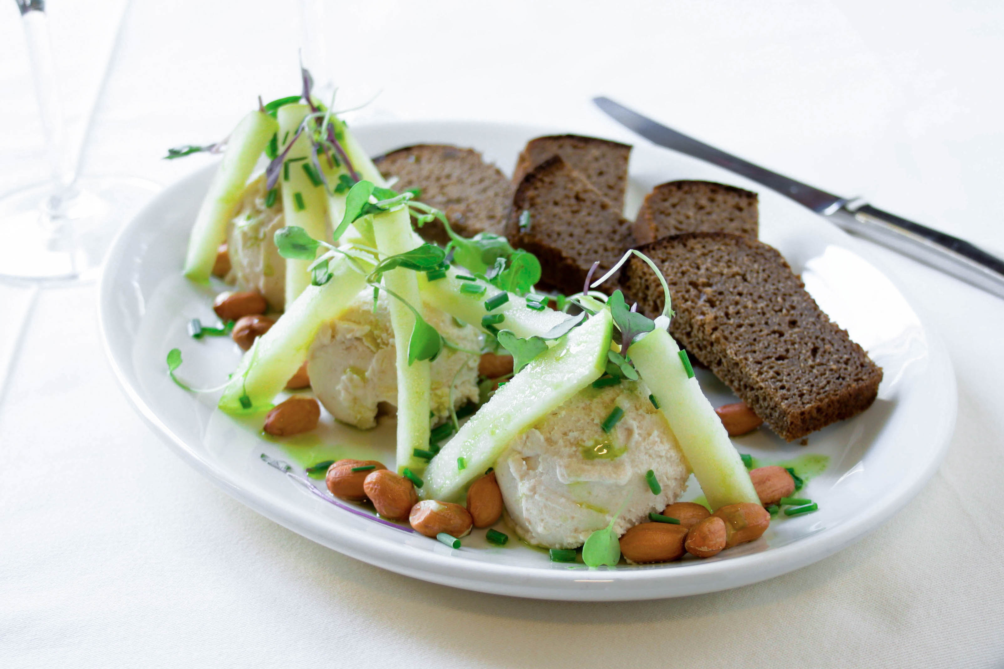 Picadillo de arenque y manzana sobre tostadas de pan negro de Borodino.