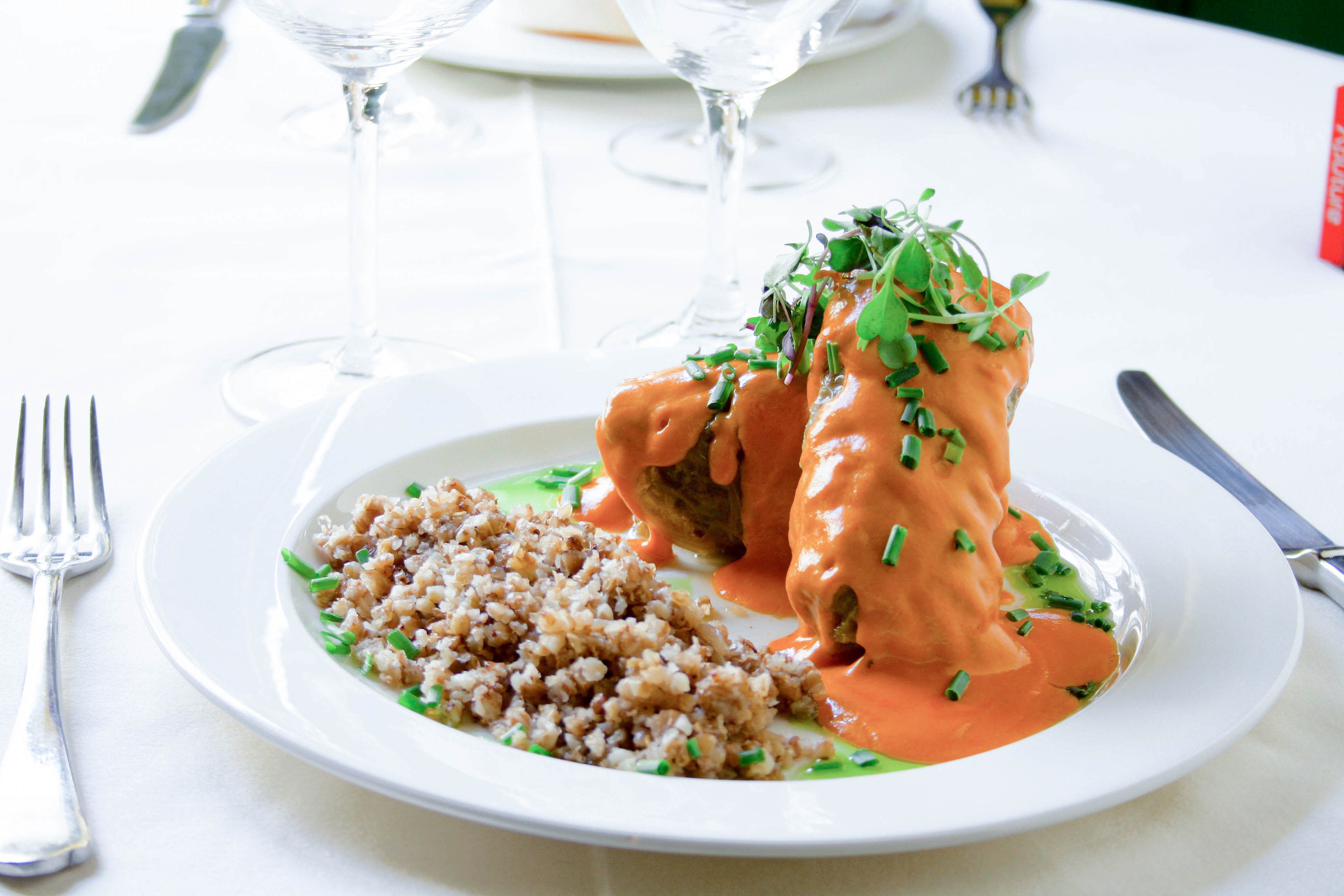 Rollos de repollo rellenos de carne picada al horno con salsa de bechamel.