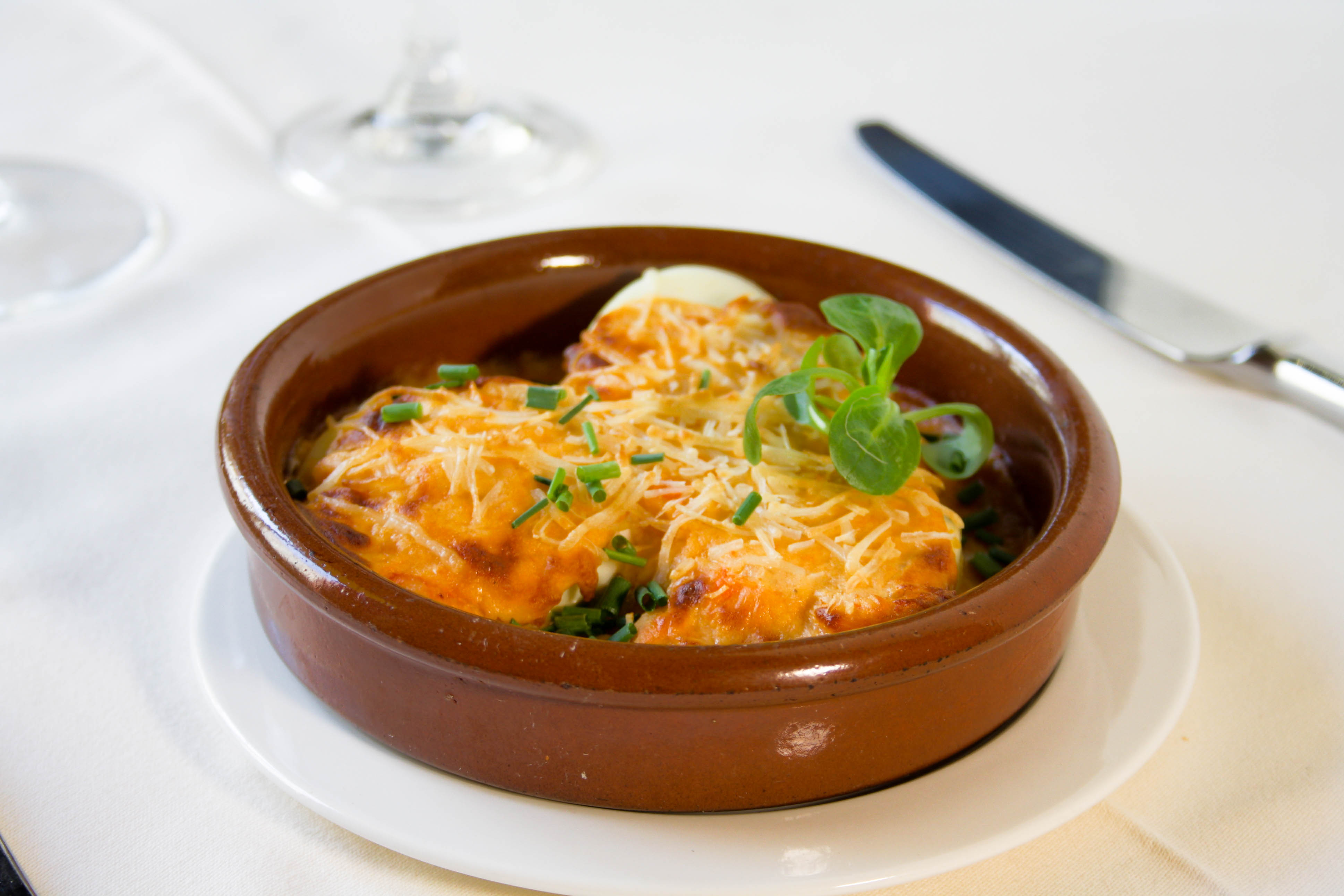 Cazuelita de huevos rellenos de gambas y gratinados con queso.