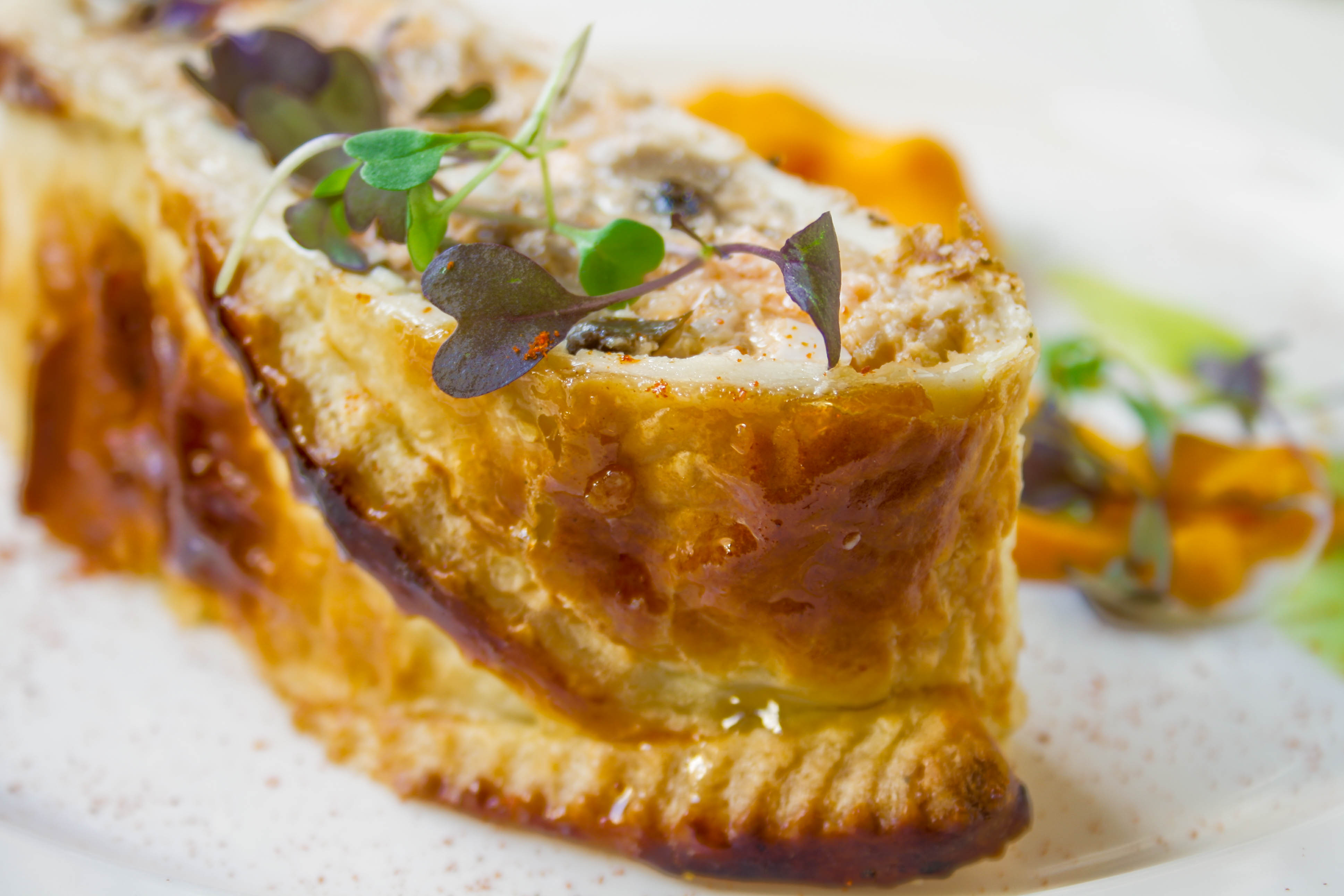 Blinis tradicionales rellenos de carne en salsa cremosa de setas rebozuelos.