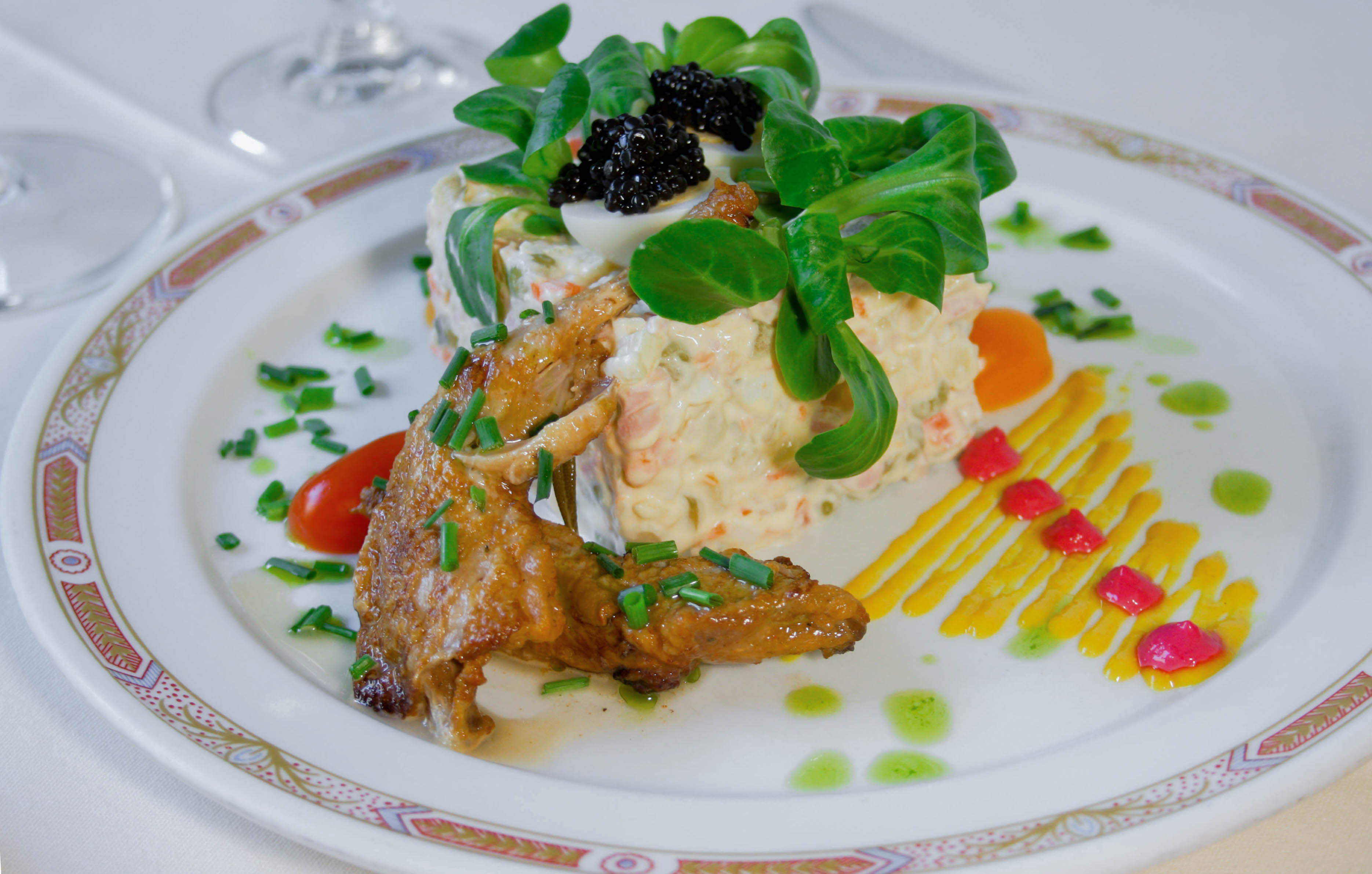 Ensaladilla rusa con jamón y huevos de codorniz.