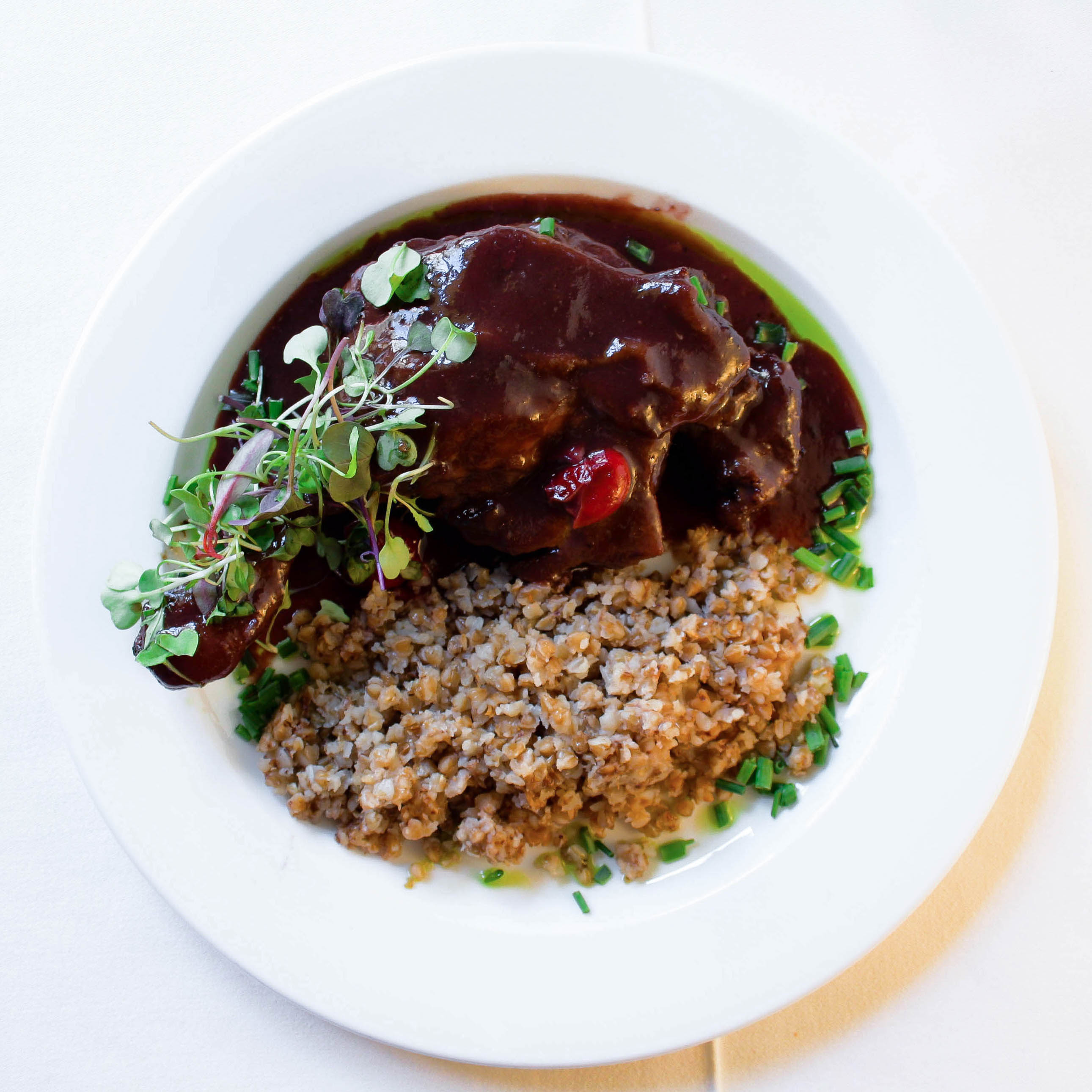 Muslo de pato confitado con salsa de guindas.