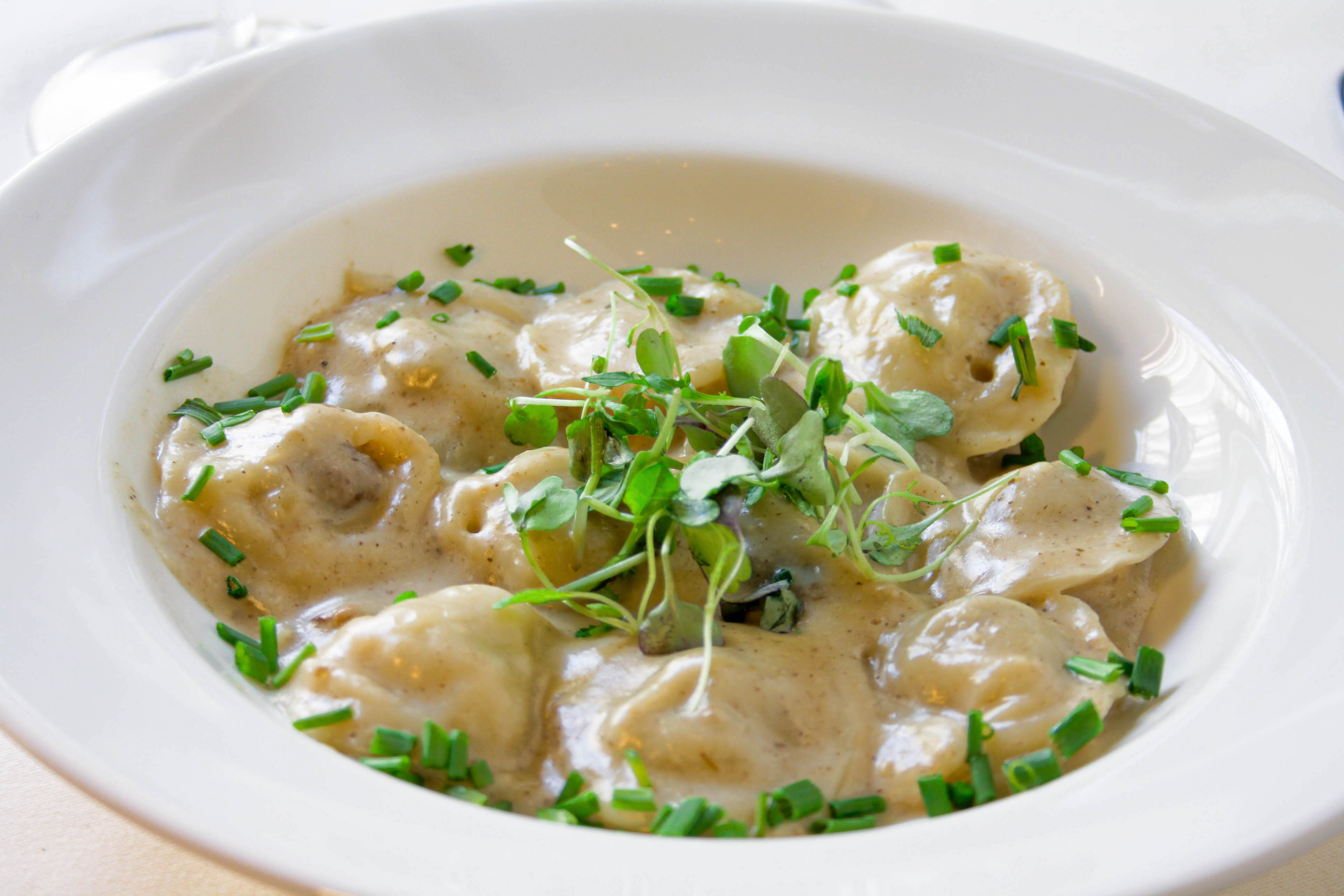 Pasta rellena con carne, salteado en salsa cremosa de champiñones.