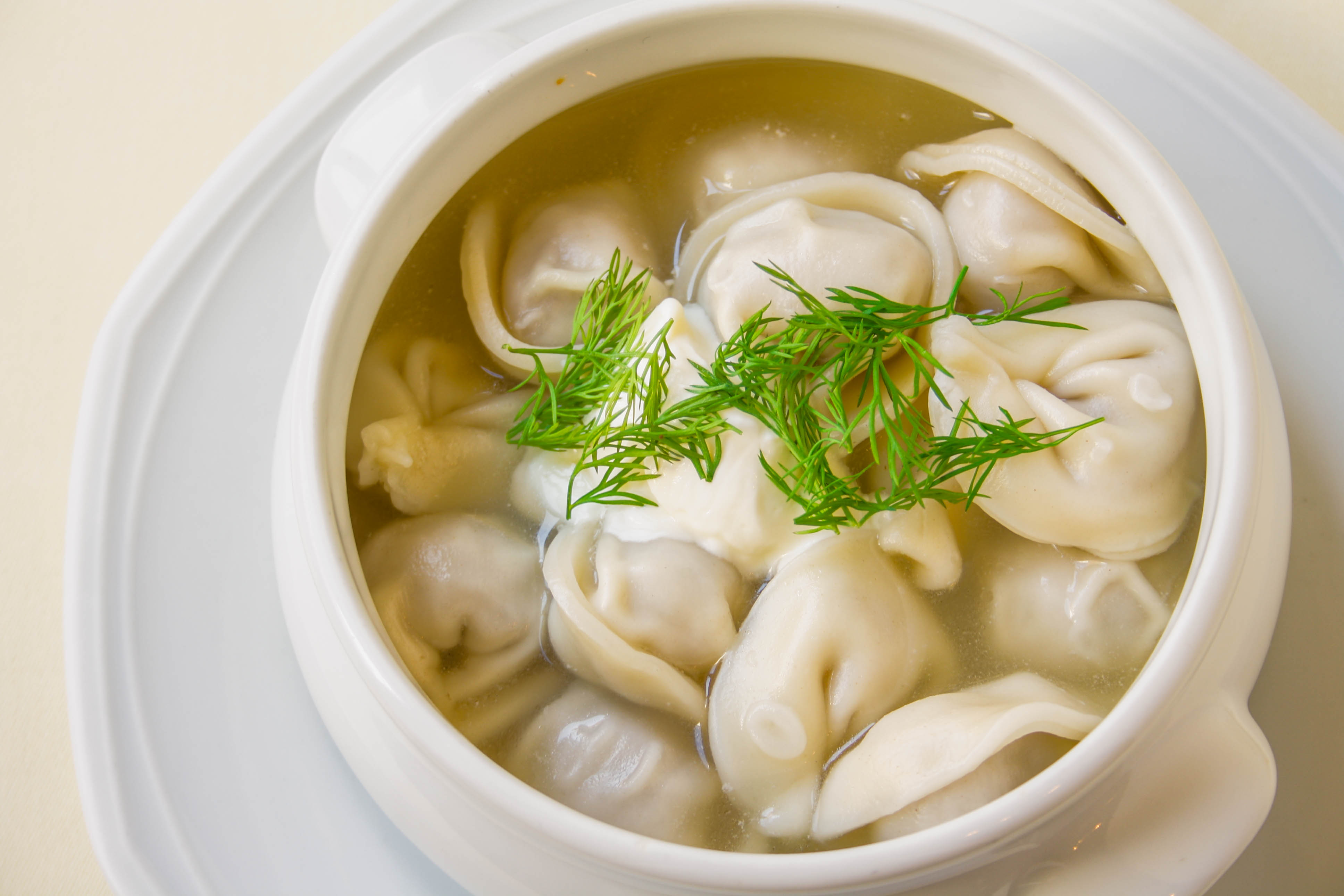 Pasta rellena con carne en caldo de pollo con smetana.