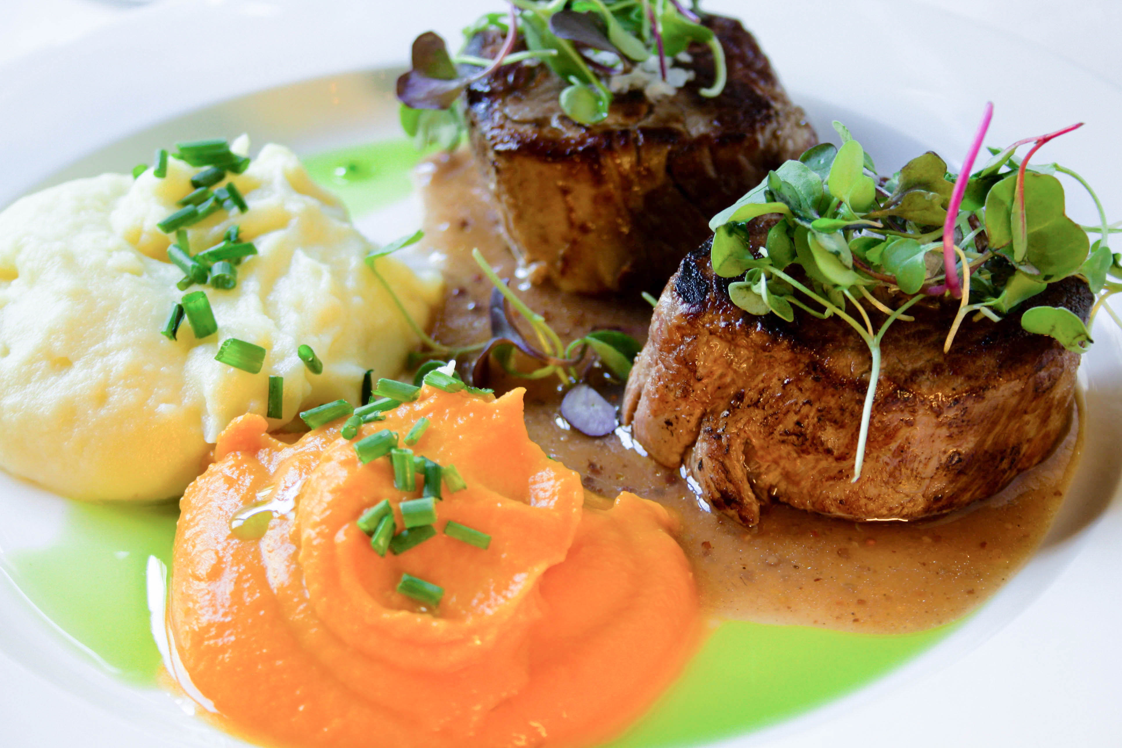 Delicados medallones de solomillo de vaca en salsa de finas hierbas.