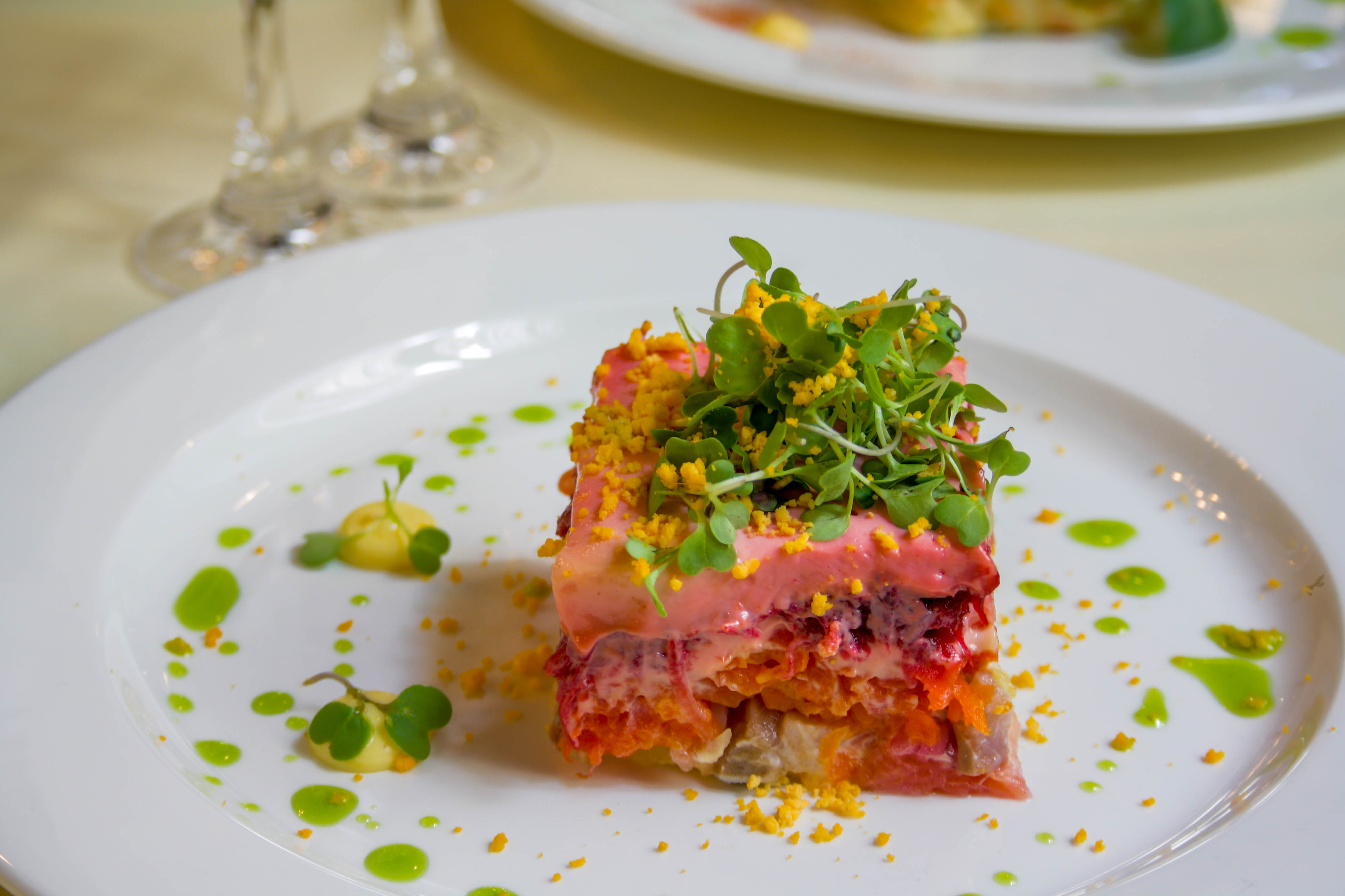 Carne de gallo en su propia gelatina con puré de patata y rábano picante ruso.