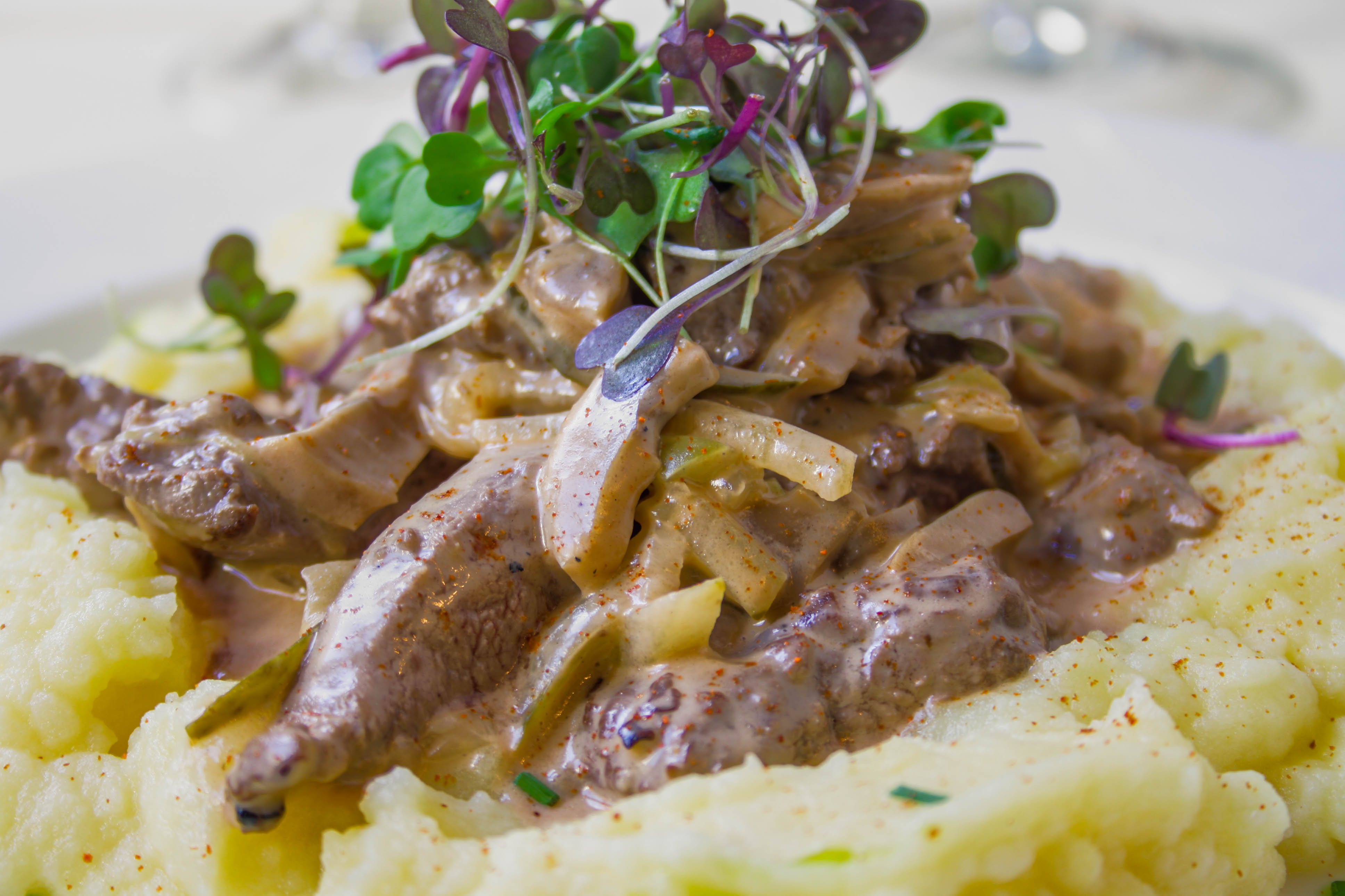 En tiras, en salsa según receta tradicional con setas y pepinillo.