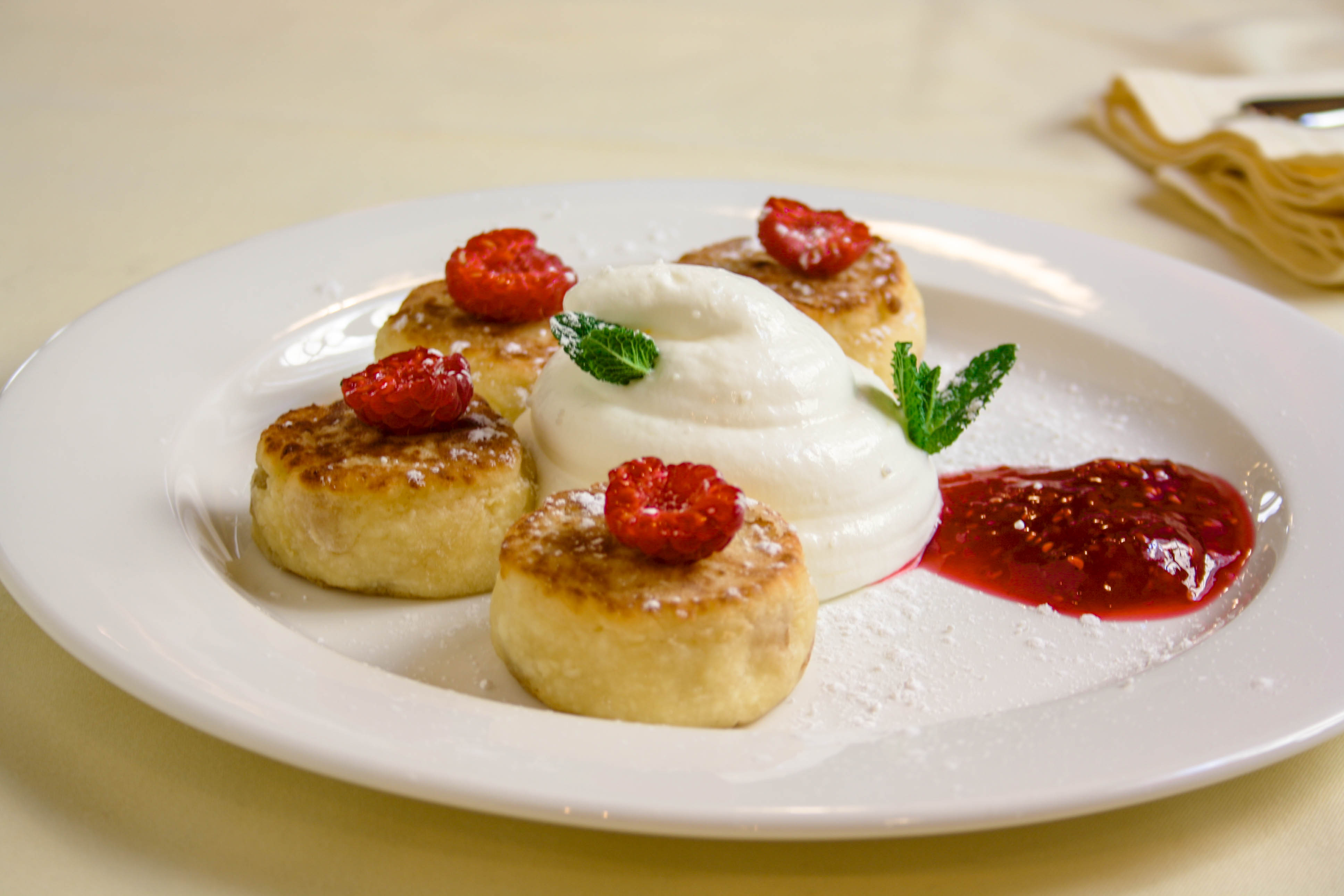 Tortitas de requesón tiernas fritas con pasas.